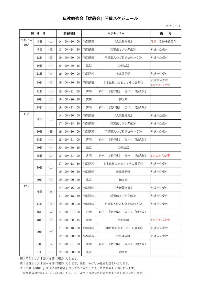 仏教勉強会「群萌会」開催スケジュール 2025(令和7年)10月~12月